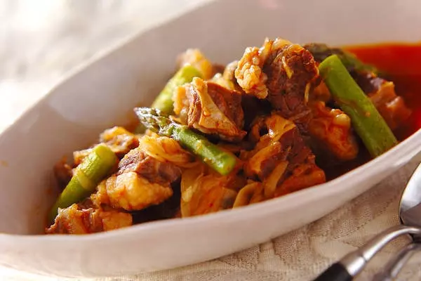 1、牛バラ肉は3cm角に切り、塩、コショウをして小麦粉をまぶす。玉ネギは縦に薄切り、マッシュルームは薄切りにする。ニンニクはつぶしておく。グリーンアスパラは皮とハカマを削ぎ取り、茎の付け根の固い部分を切り落とし、塩ゆでする。