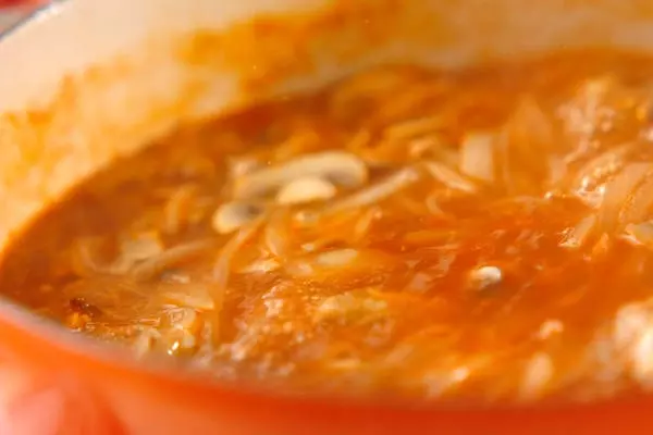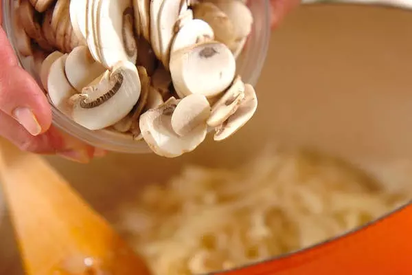 3、(2)の鍋に玉ネギを加えてしんなりするまで炒め、マッシュルームを加えてさらに炒める。