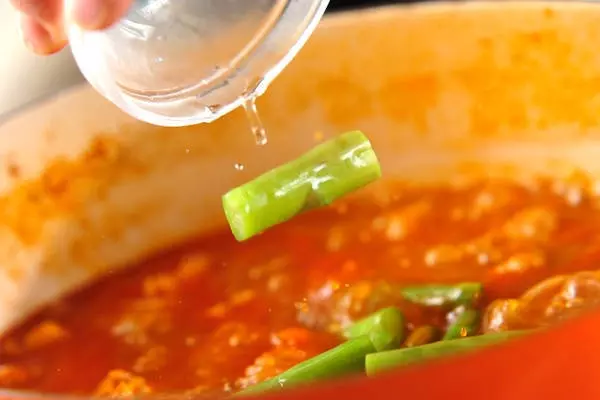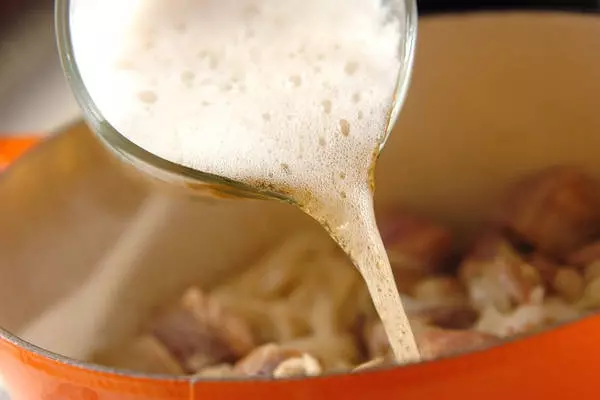 4、(3)の鍋に(2)の牛バラ肉を戻し入れ、ビールを加えて木ベラで鍋底をこそげ取る。