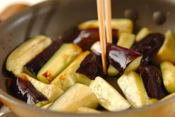 1、ナスはヘタを切り落として縦4つのくし切りにし、さらに食べやすい長さに切ってフライパンに入れ、サラダ油を多めに入れて揚げ焼きにする。