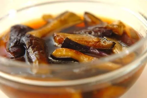 2、ナスに柔らかく火が通ったら油をきり、<合わせだし>のボウルに漬ける。ボウルの底を氷水に当てて冷やし、味をよくなじませる。