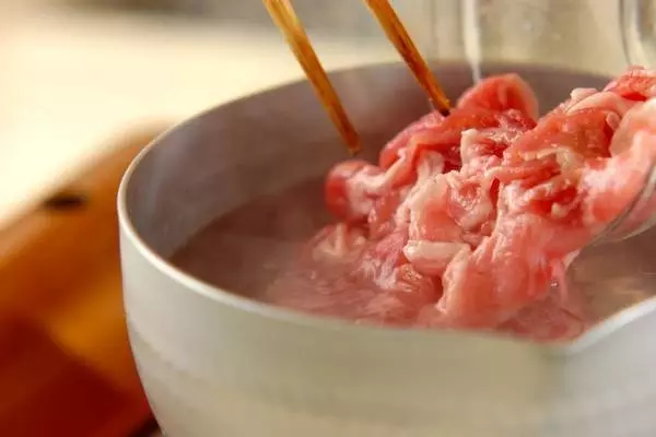 3、鍋に湯を沸かして酒を入れ、火を止めて豚肉を入れる。湯の中で広げて再び中火にかけ、再沸騰したらザルに上げ、<調味料>のボウルに漬ける。
