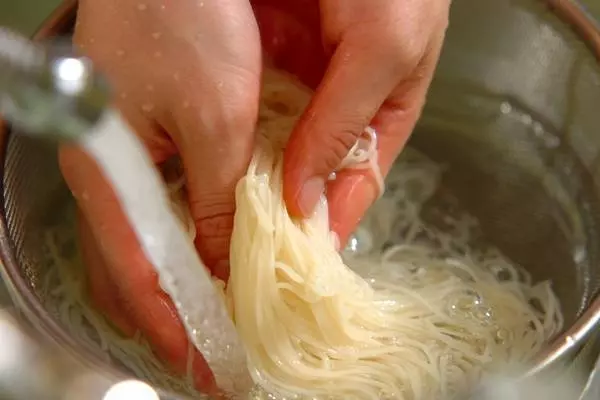 4、素麺を袋の指定時間ゆで、ザルに上げる。冷水でもみ洗いしてぬめりを取り、水気をきって器に盛る。