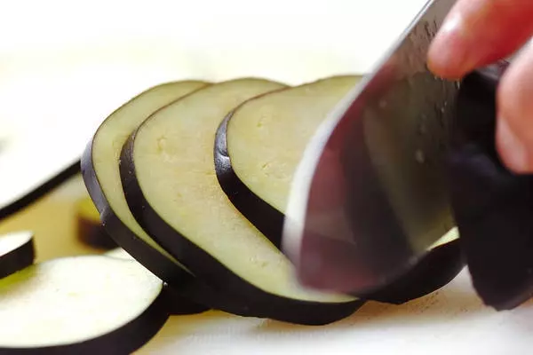 ・ナスはヘタを取り、幅7mmの輪切りにする。