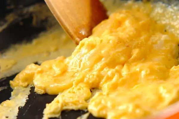 1、フライパンにサラダ油小さじ2を熱し、卵液を流し入れ、半熟状になったらいったん取り出す。