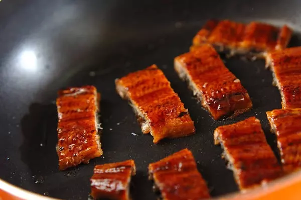 2、フライパンに残りのサラダ油を熱し、ウナギ蒲焼きと酒を加え、蒸し焼きにする。