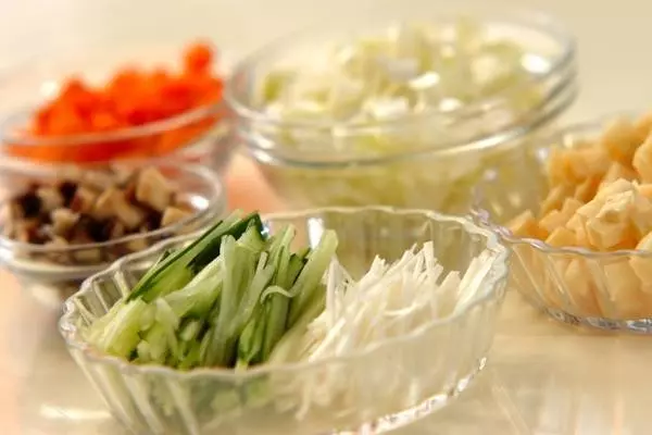 ・ニンジン、水煮タケノコは5mmの角切りに、白ネギは粗みじん切りにする。<トッピング>のキュウリ、白ネギはせん切りにする。