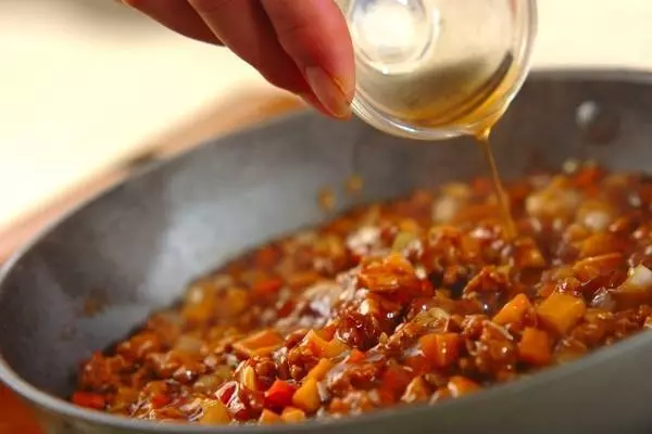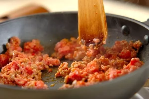 1、フライパンにサラダ油を熱し、ショウガ、ニンニク、豆板醤を香りがでるまで炒めたら、豚ひき肉を入れ、炒める。