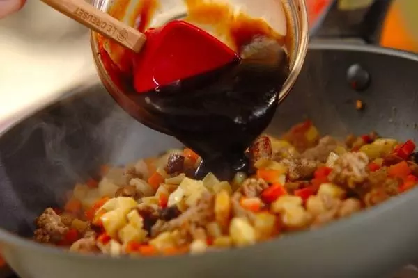 2、(1)にシイタケ、水煮タケノコ、ニンジンを加え、炒める。火が通ったら<調味料>の材料を入れ、味がなじむように炒める。強火にかけ、煮立ったら鶏ひき肉を加える。ポロポロになってきたらアクを取り、白ネギを加える。