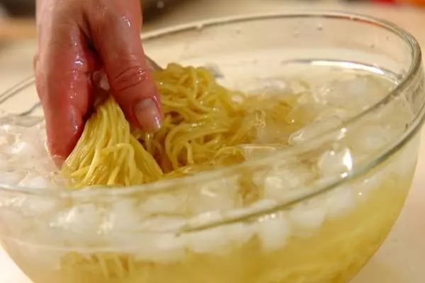 4、中華麺を指定の時間通りにゆでる。水で冷やした後、氷水でしっかりしめる。ザルにあけ、水気をきる。