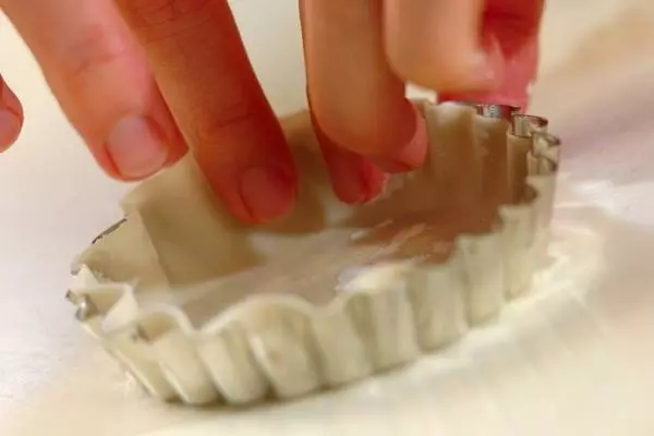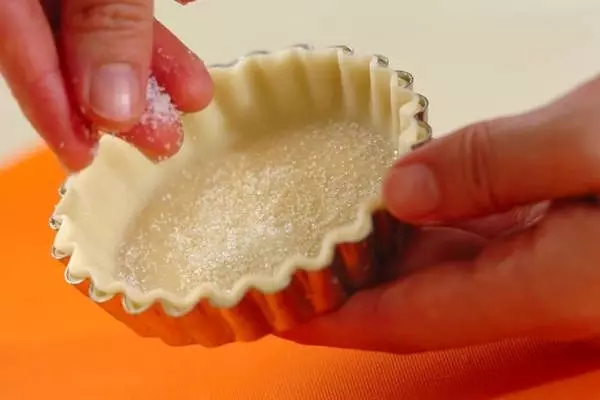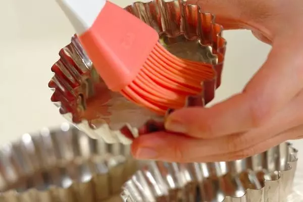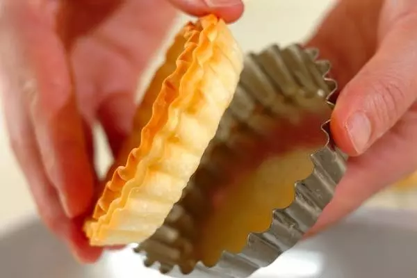 1、タルト型に餃子の皮をしきこみ、さらにその上にバターをぬり、餃子の皮を敷く(2回繰り返し3層にする)。