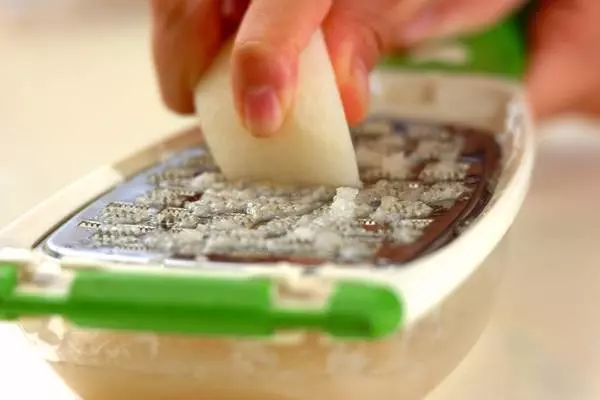 1、梨は縦4つのくし切りにして芯を取り除き、皮をむいてすりおろす。