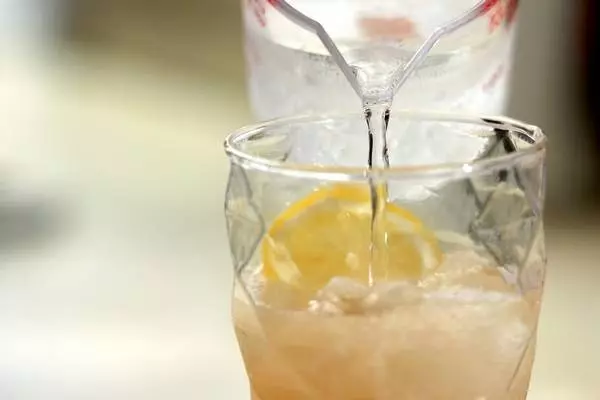 2、カップに(1)、レモン、氷を入れ、炭酸飲料を注ぎ入れる。ミントの葉を飾る。