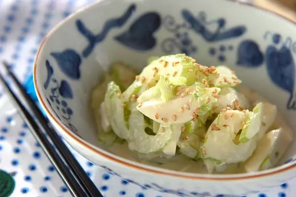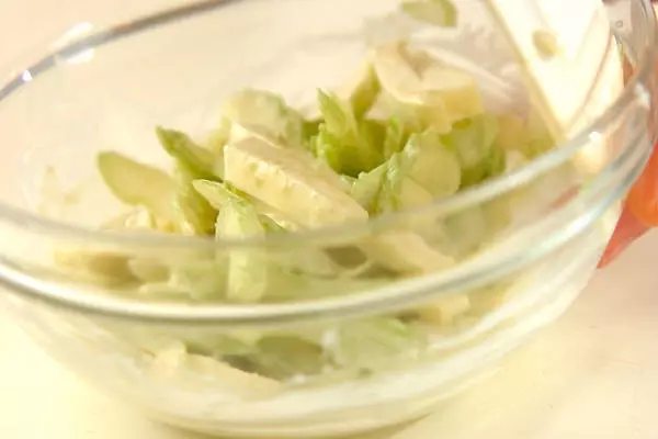 今回のレシピは、セロリとワサビの組合せで少し大人向けの味わいです。セロリには固い筋がありますので、下ごしらえの際はしっかり取るようにしてください。