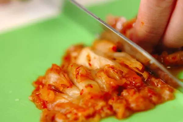 1、白菜キムチと白ネギは粗みじん切りにする。