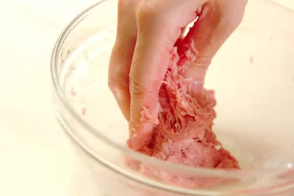 2、<タネ>を作る。ボウルに豚ひき肉、塩を入れて、粘りが出るまで混ぜる。さらに(1)を加えて混ぜる。