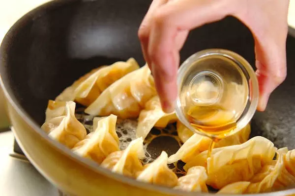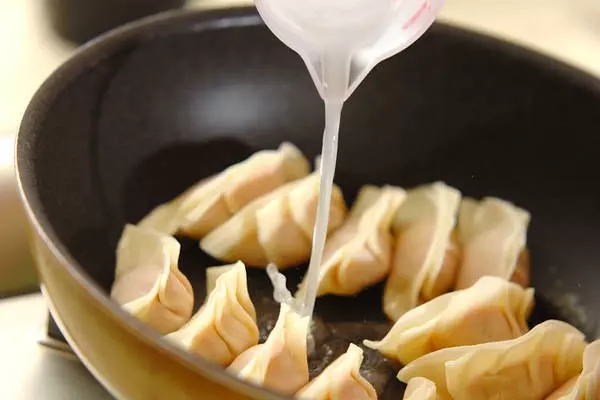 4、フライパンにサラダ油を入れて強火にかけ、餃子を並べる。焼き色がついてきたら、よく混ぜ合わせた<水溶き片栗>の材料を加え、フライパンの蓋をして蒸し焼きにする。