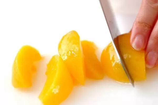 ・黄桃は汁気をきり、4等分のくし形に切る。