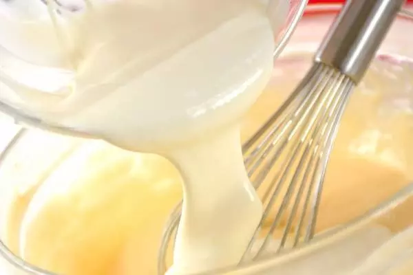 1、<生地>を作る。ボウルに生クリームとグラニュー糖を入れ、7分立てにする。別のボウルに卵を割りほぐし、プレーンヨーグルト、乳酸菌飲料を加え混ぜ合わせる。混ぜ合わさったら生クリーム、振るった粉類を加え、泡立て器で混ぜ合わせる。※乳酸機飲料は5倍希釈のものを使用しました。