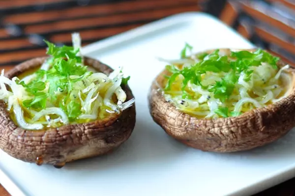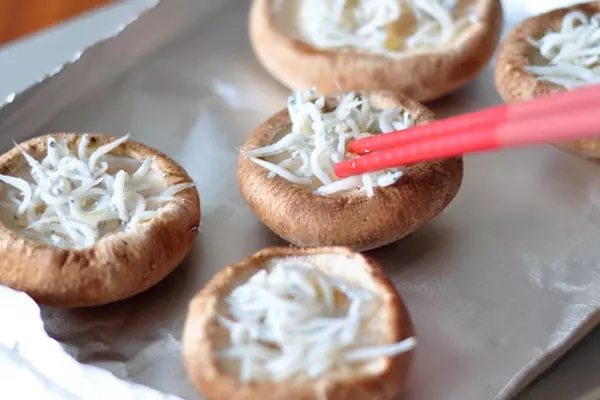 しいたけを器に見立てて、しいたけのひだの部分ににんにくとオリーブ油、しらすをのせてトースターで加熱をします。