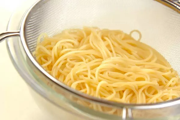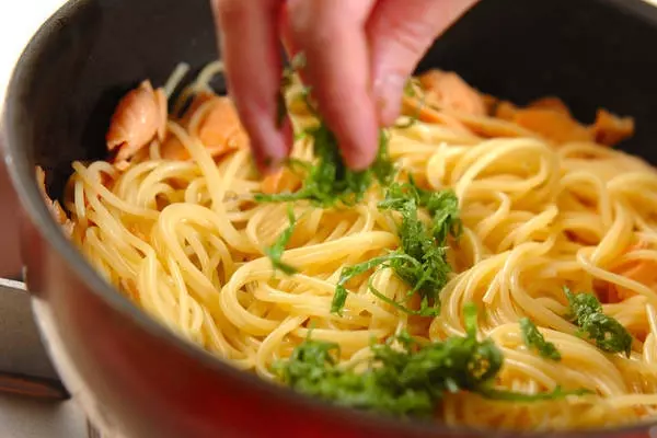 1、パスタは塩の入ったたっぷりの熱湯で袋の表示時間通りにゆで、ザルに上げる。大葉は軸を切り落としてせん切りにする。