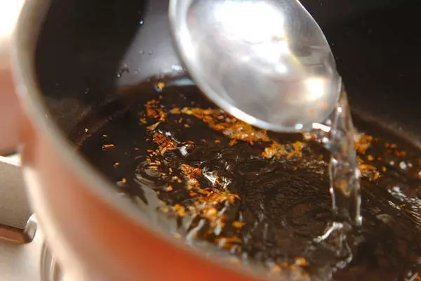 2、フライパンに、ニンニク、オリーブ油を加え、弱火で香りを出す。ニンニクがキツネ色になったら刻み赤唐辛子、パスタのゆで汁お玉1.5杯分を加える。