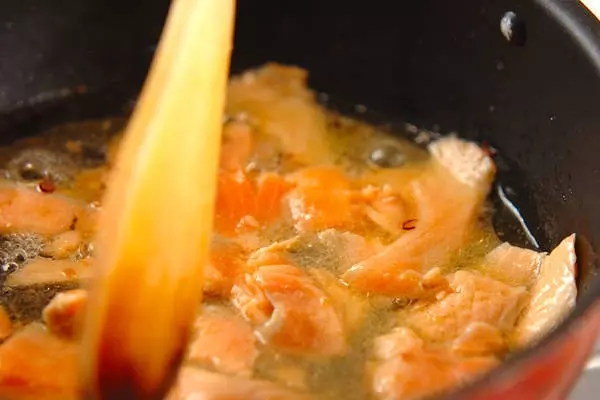 3、(2)にスモークサーモンを加え、木ベラで少し崩しながらスモークサーモンの色が変わるまで火を通す。