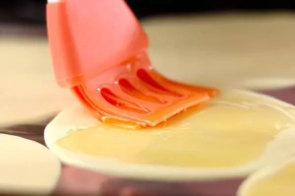 1、餃子の皮の上面にオリーブ油をぬり、トースターで薄く焼き色がつくまで焼く。
