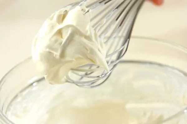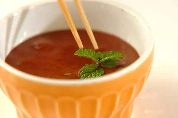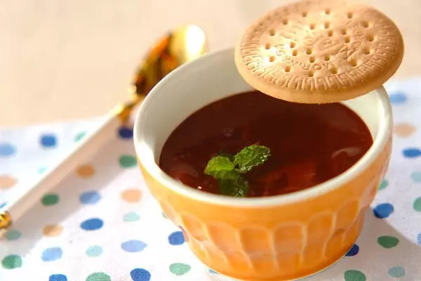 2、(1)の粗熱が取れたら、泡立てた生クリームを入れて混ぜ合わせる。器に盛り、ビスケットとミントの葉を飾る。