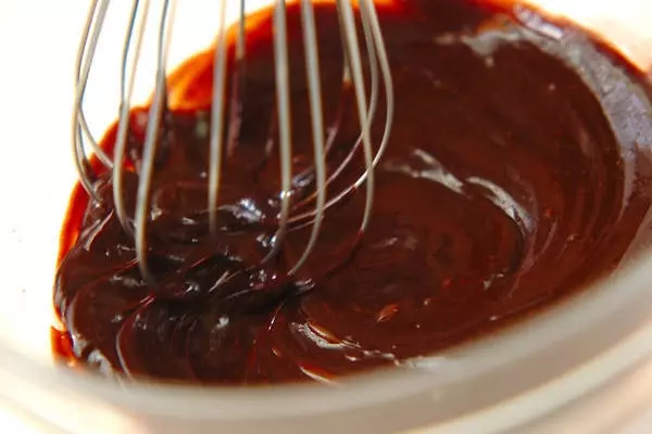 1、耐熱ボウルにチョコレートと残り(泡立てなかった)の生クリームを入れ、ラップをかけて電子レンジで1分加熱し、泡立て器でなめらかになるまで混ぜる。電子レンジは600Wを使用しています。
