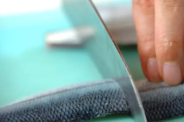・サンマは尾から頭に向かって包丁でぬめりをこそげる。頭を落とし、腹側に切り込みを入れて包丁でワタを出す。水洗いして水気を拭き取る。頭側の中骨の上に包丁を入れ、骨にそって尾まで滑らせるように切る(2枚おろし)。次に中骨を下に置き、背側から中骨の上に包丁を入れ、尾に向かって包丁を滑らせるように切る(3枚おろし)。身側の腹骨を包丁を寝かせて削ぎ落とし、半身を半分に切る。
