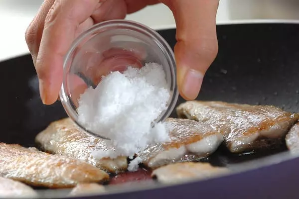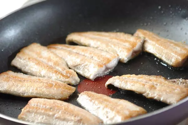 1、フライパンにサラダ油をしいて中火で熱し、薄く小麦粉をまぶしたサンマを身側から並べ入れ、焼き色がつくまで両面焼く。