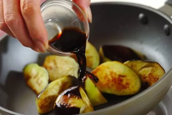 1、フライパンにオリーブ油を入れて中火で加熱し、ナスをサッと炒めて火を止め、バルサミコ酢をからめる。