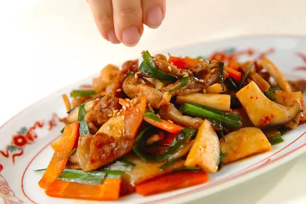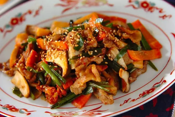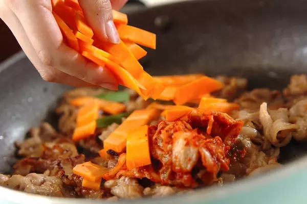 1、フライパンにゴマ油を熱して豚バラ肉を炒め、色が変わったら白菜キムチとニラ、ニンジン、エリンギを加え、炒め合わせる。