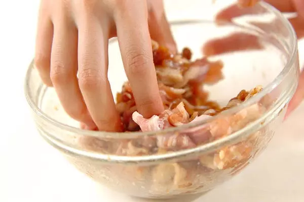 ・豚バラ肉は長さ4~5cmに切り、<下味>の材料をもみ込む。