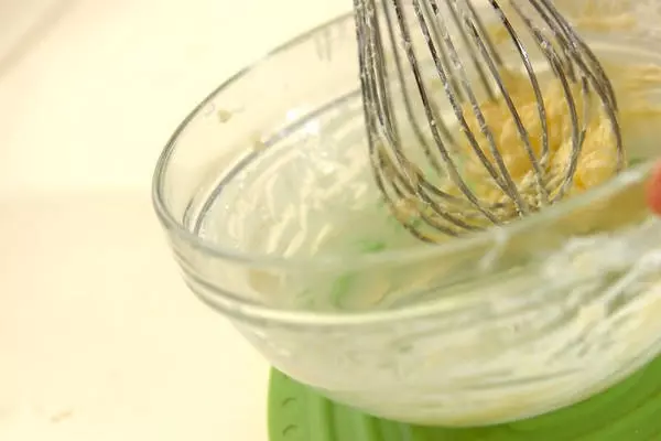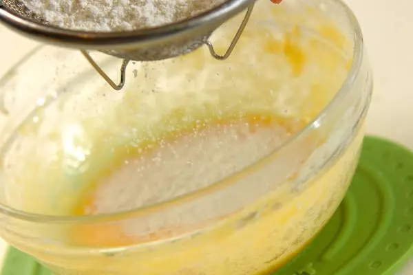 2、溶き卵を、少量ずつ加えてその都度均一に混ぜる。薄力粉を振るい入れて混ぜ合わせる。