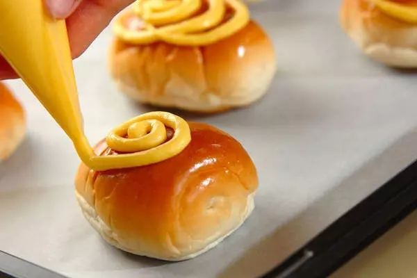 3、絞り袋に入れて、ロールパンの中心から渦巻状に絞る。オーブンで10~15分焼き色がつくまで焼く。