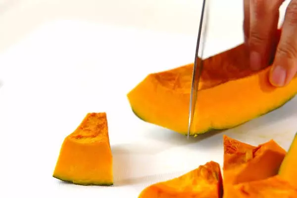 ・カボチャは種を取り、皮を所々削いでひとくち大に切る。