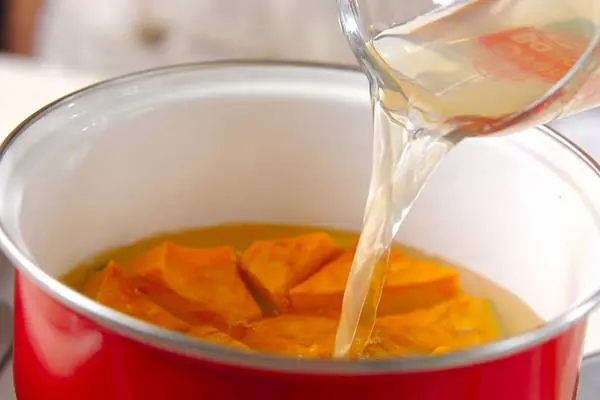 1、鍋にカボチャの皮面を下にして並べ、ひたひたのだし汁を加え、強火にかける。