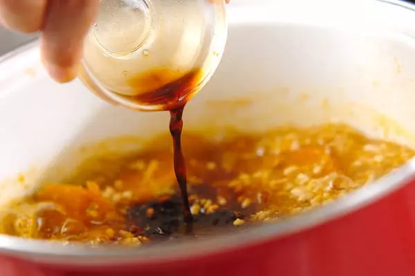2、煮立ってきたら鶏ひき肉を加えて再び煮立ったら中火にし、酒、みりん、砂糖としょうゆ大さじ1を加え、カボチャに竹串がスッと刺さる位まで、7~10分煮る。