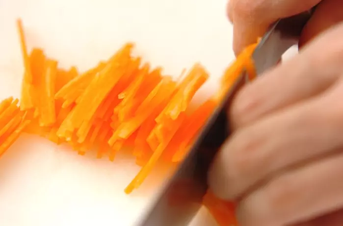 ニンジン 2/3本 は皮をむき、長さ4cmに切って縦にせん切りにする。