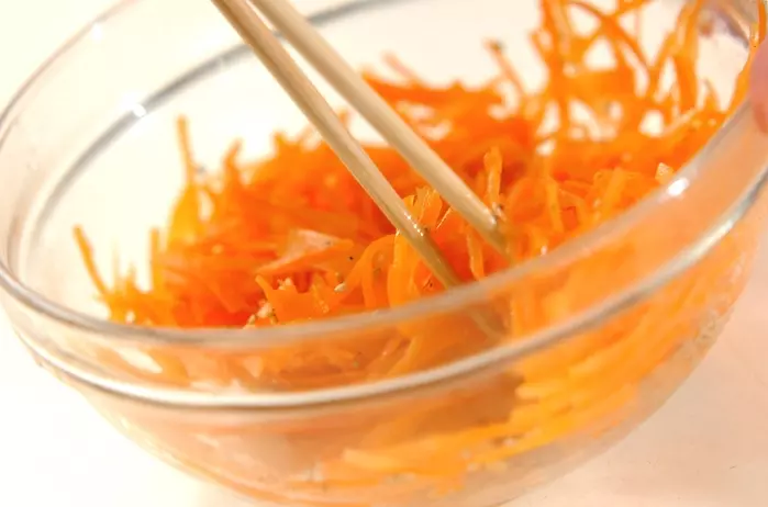 塩少々を入れた熱湯で、ニンジンをサッとゆでて水に取り、粗熱が取れたら水気をしっかり絞る。塩コショウ 少々、白ゴマ 小さじ1、ゴマ油 小さじ1 を加えてよく混ぜ合わせ、器に盛る。