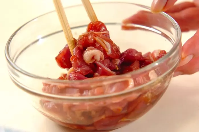 [調味料]の オイスターソース 大さじ1、ショウガ(すりおろし) 1片分、みりん 大さじ1 を混ぜる。