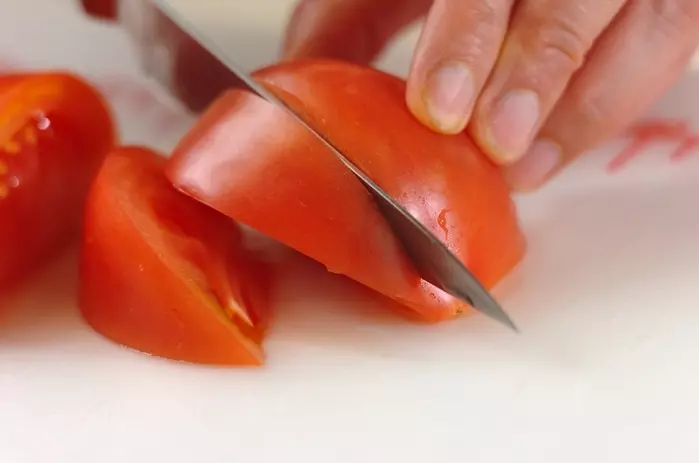 トマト 2個 はヘタをくり抜き、6~8等分のくし切りにして器に並べる[ネギソース]をかけ、大葉をのせる。