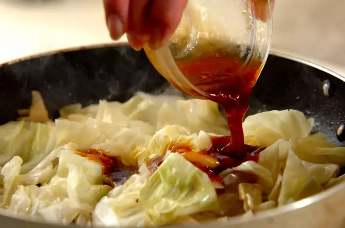 しんなりしたら蓋を外して強火で水分を飛ばし、[調味料]、豚肉を炒め合わせて器に盛る。