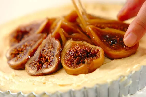 7、(6)に(5)の<クレームダマンド>を入れてまんべんなくのばし、その上に食べやすい大きさに切った(3)の<ドライイチジクのシロップ煮>を並べ、180℃に予熱しておいたオーブンで30~40分焼く。