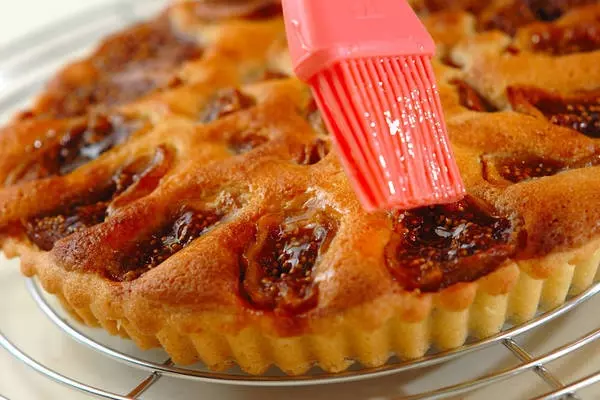 8、(7)が焼けたら、型から外して冷ます。冷めたら表面のイチジクに<仕上げ用>のナパージュをぬる。