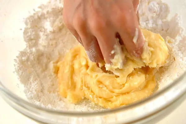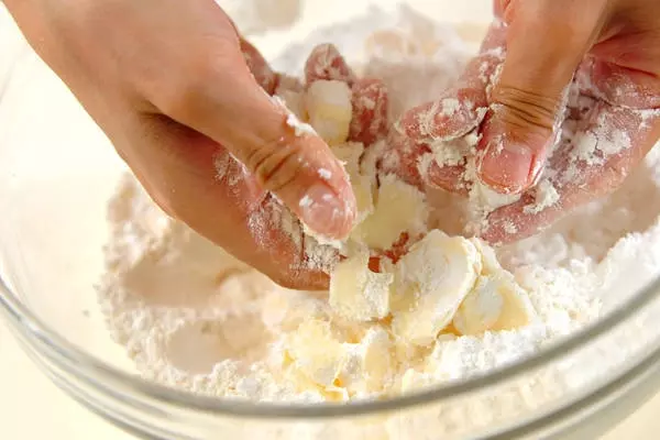 2、(1)の無塩バターの粒がなくなってきたら、指先で円を描くようにしながら、少しずつ周囲の薄力粉をくずして中央に混ぜ込んでいく。ひとつにまとまったらラップに包んで冷蔵庫で30分~1時間休ませる。※フードプロセッサーを使用する場合は、全ての材料を入れて混ぜ合わせて下さい。