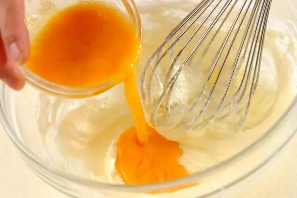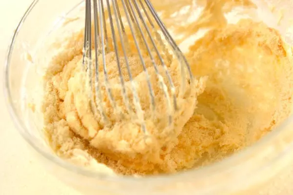 4、<クレームダマンド>を作る。ボウルに無塩バターを入れて泡立て器で混ぜ、グラニュー糖を加えて白っぽくなるまで混ぜる。その中に溶きほぐした卵を加え、さらに混ぜる。