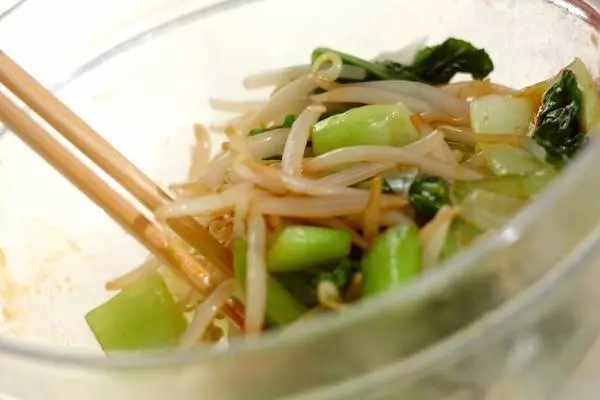 1、フライパンにサラダ油、ニンニクを入れて中火にかける。香りがたってきたら、チンゲンサイと太モヤシを加え、分量外の塩ひとつまみを振り炒める。